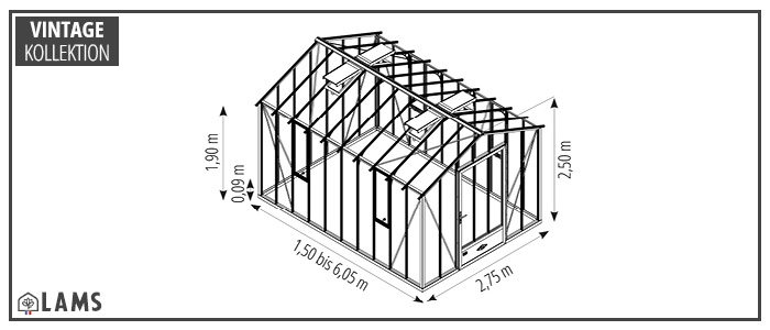 Das Gewächshaus AUTHENTIQUE mit Aluminium-Fundamentrahmen ist 2,75 m breit, in vier Längen erhältlich (ab 1,50 bis 6,05 m) und ist ausgestattet mit einer Einzeltür (B. 1,00 x H. 1,95 m) an einer der Giebelseiten und Fenster an den Längsseiten und am Dach.
