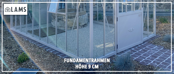 Der 9 cm hohe Fundamentrahmen ist aus Aluminium und wird in der gleichen Farbe wie die Ihres Gewächshauses lackiert. Es ist zwingend erforderlich, dass der Fundamentrahmen auf einer ebenen Betondecke (oder Rahmen) aufgestellt ist.