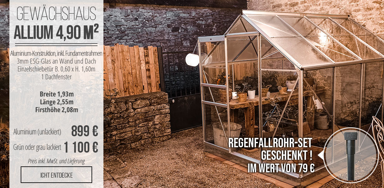 - Verarbeitung : Fundamentrahmen im Lieferumfang enthalten. Regenrinne und Ø 50 mm Fallrohr aus Aluminium (ideal für das Auffangen von Regenwasser), optional zusätzliche Türen und Fenster.