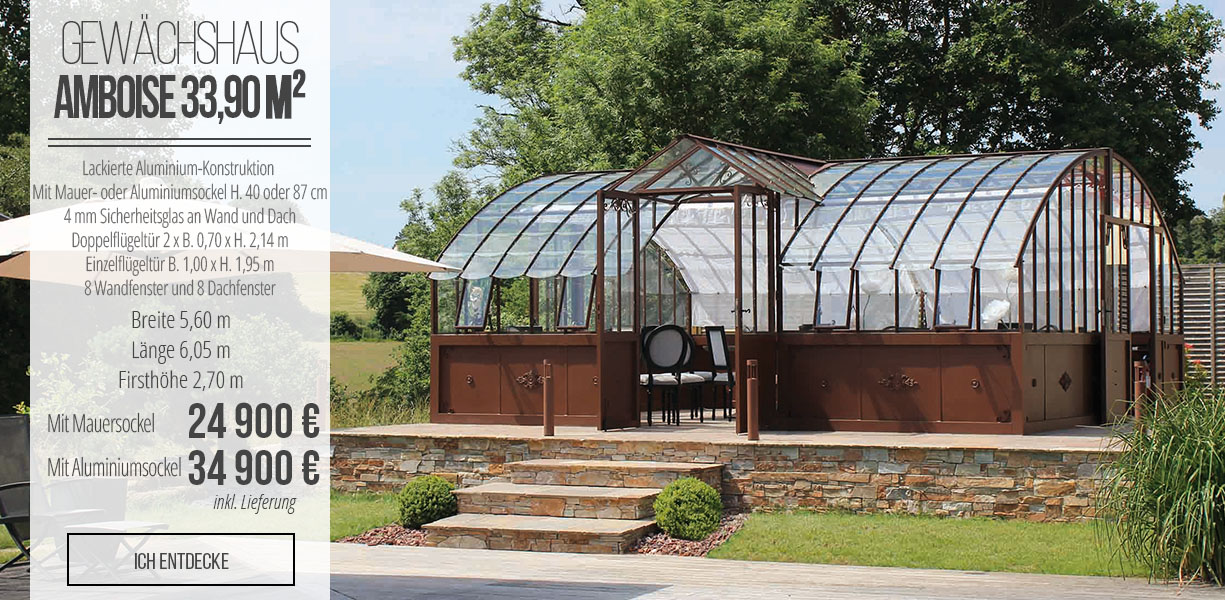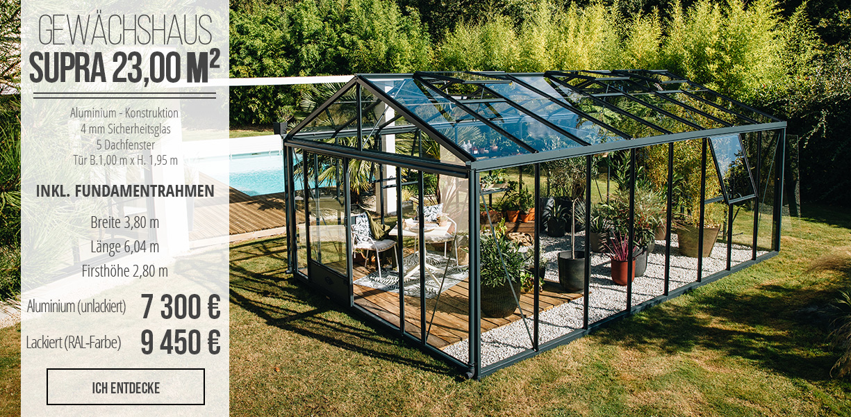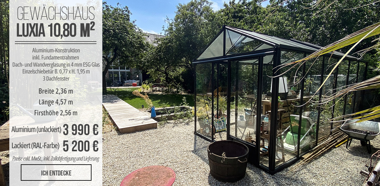 Gewächshaus LAMS stellt sich hochwertige Gewächshäuser vor, die dem Geschmack eines jeden Gartenliebhabers entsprechen. Die Kollektionen Natura, Azura und Vintage garantieren Gewächshäuser für jedes Budget - ab 429 € exkl. MwSt. und inkl. Lieferung - und für jeden Stil. In den gewünschten Farben lackiert, auf Punkt- oder Streifenfundament, für Flächen von 0,90 m² bis über 100 m²: Gewächshaus LAMS ist der einzige französische Hersteller, der ein so umfassendes Sortiment anbietet. Und für noch mehr Individualität werden zahlreiche Optionen und Zubehörteile angeboten.