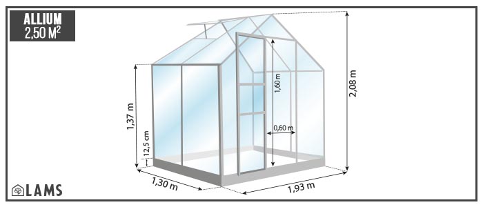 Das Gewächshaus Allium 2,50 m² besteht aus einer Konstruktion aus Aluminium, einem Dach und Wänden aus 3 mm Sicherheitsglas, einer Schiebetür und einem Dachfenster.