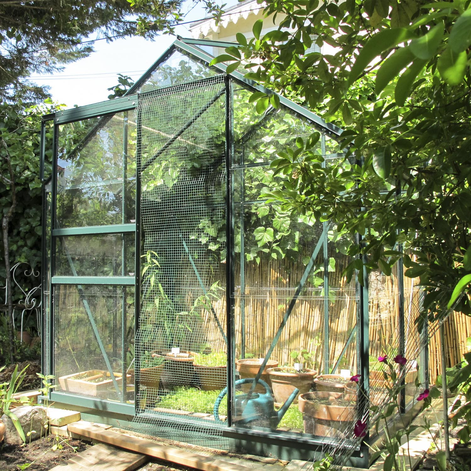 - Die Belüftung des Gewächshauses erfolgt durch 1 Schiebetür (B. 60 x H. 160 cm) und 1 Dachfenster (automatische Fensteröffner optional).