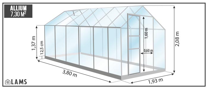 Das Gewächshaus Allium 7,30 m² besteht aus einer Konstruktion aus Aluminium, einem Dach und Wänden aus 3 mm Sicherheitsglas, einer Schiebetür und einem Dachfenster.