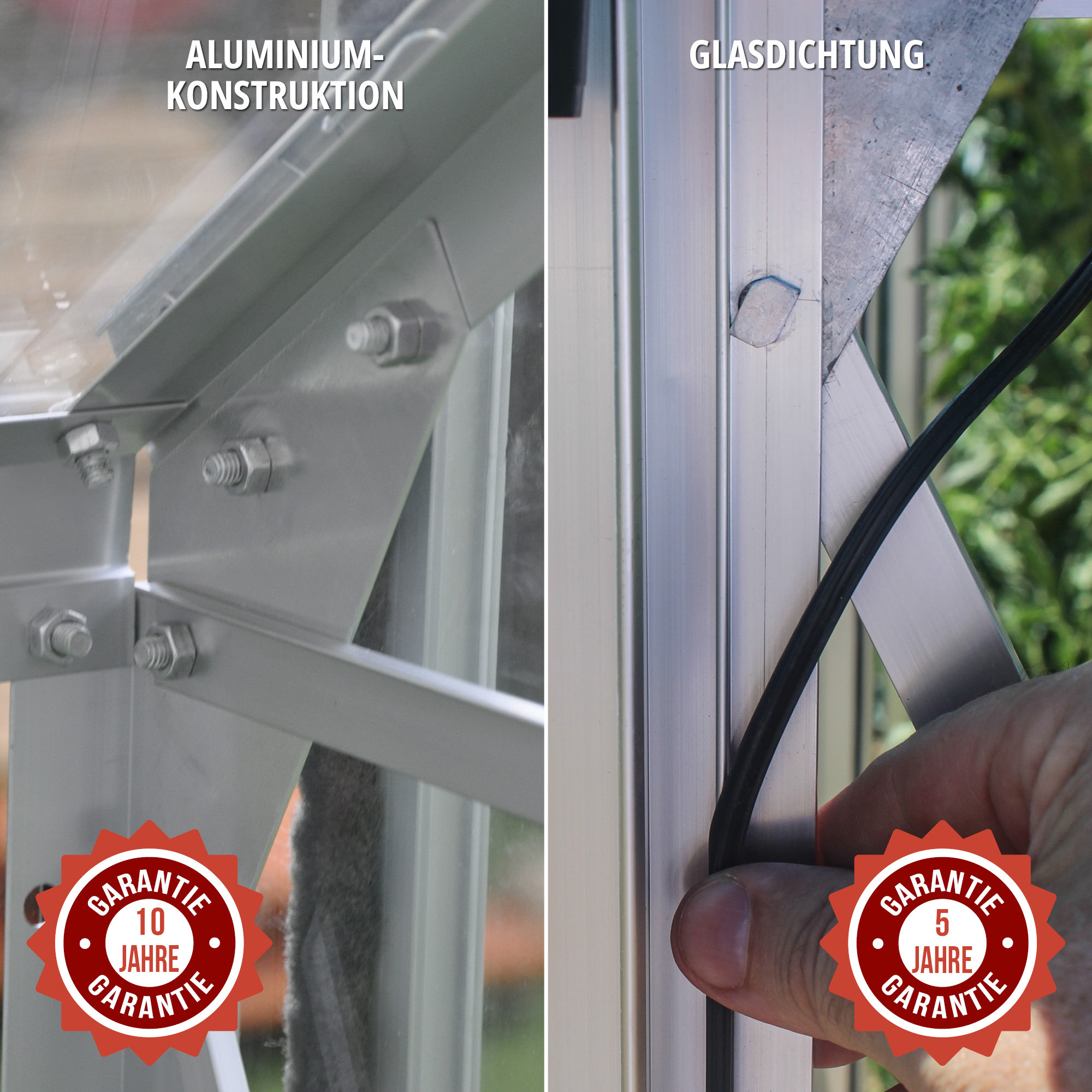 Unsere Gewächshäuser haben ab Auslieferungsdatum eine 10-jährige Garantie für die Aluminium-Konstruktion, sowie 5 Jahre für die Verglasungsdichtung.