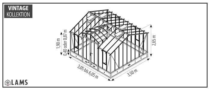 Das Gewächshaus CLASSIQUE mit Dachgaube und Aluminiumsockel ist 3,50 m breit, in fünf Längen erhältlich (ab 3,05 bis 6,05 m) und ist ausgestattet mit einer Doppeltür (2 x B. 0,77 x H. 1,95 m) an der Längsseite und Fenster an den Längsseiten und am Dach.