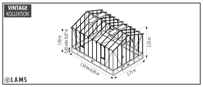 Das Gewächshaus CLASSIQUE mit Mauersockel ist 2,75 m breit, in sieben Längen erhältlich (ab 1,50 bis 6,05 m) und ist ausgestattet mit einer Einzeltür (B. 1,00 x H. 1,95 m) an einer der Giebelseiten und Fenster an den Längsseiten und am Dach.