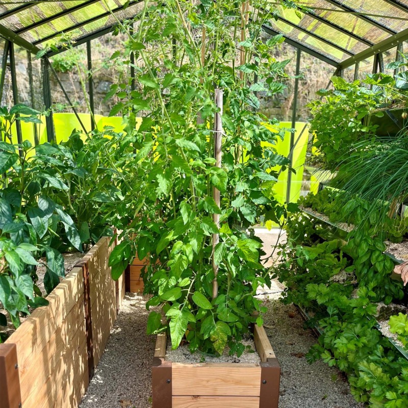 Die 4 mm dicke Verglasung aus Sicherheitsglas wird mit Edelstahlclips befestigt, um eine einfache Montage zu ermöglichen. Das gerundete Dach besteht aus kleinen, ziegelförmigen Glasscheiben, um den Charme der Gewächshäuser von früher zu erhalten.