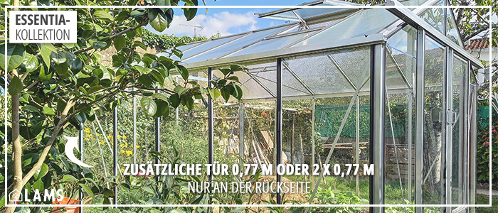 Das Gewächshaus ist mit einer Doppelschiebetür in Maßen ausgestattet (Türmaße: 2 x B 0,77 x H 2,00 m). Optional kann ausschließlich an der Rückseite des Giebels eine zusätzliche Tür eingebaut werden: eine Einzelschiebetür mit einer Breite von 0,77 m oder eine Doppelschiebetür 2 x 0,77 m.