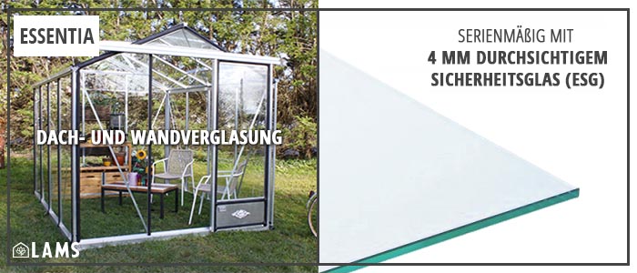 Alle unsere Gewächshäuser sind serienmäßig mit 4 mm durchsichtigem Einscheiben-Sicherheitsglas (ESG) ausgestattet: Sicherheitsglas ist gehärtet und somit, im Gegensatz zu herkömmlichem Blankglas, bei einem Bruch nicht scharfkantig. Neben Stabilität und Langlebigkeit lässt dieses gesicherte Blankglas das meiste Sonnenlicht ins Gewächshaus (80-95%). Sie können einen Schattentuch nutzen um Ihre Pflanzen vor starker Sonnenstrahlung zu schützen.