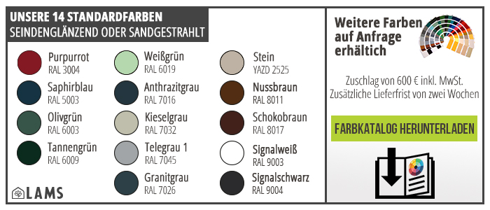 Gegen einen Aufpreis von 600 € (inkl. MwSt.) und einer zusätzlichen Lieferzeit von zwei Wochen können wir die RAL-Farbe Ihrer Wahl herstellen.