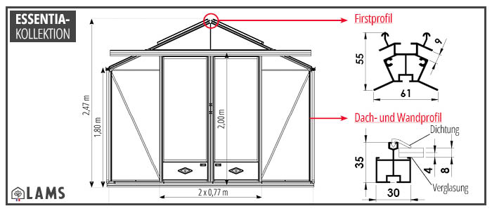 Maße des Gartengewächshauses Essentia mit einer 3,09 m langen Fassade