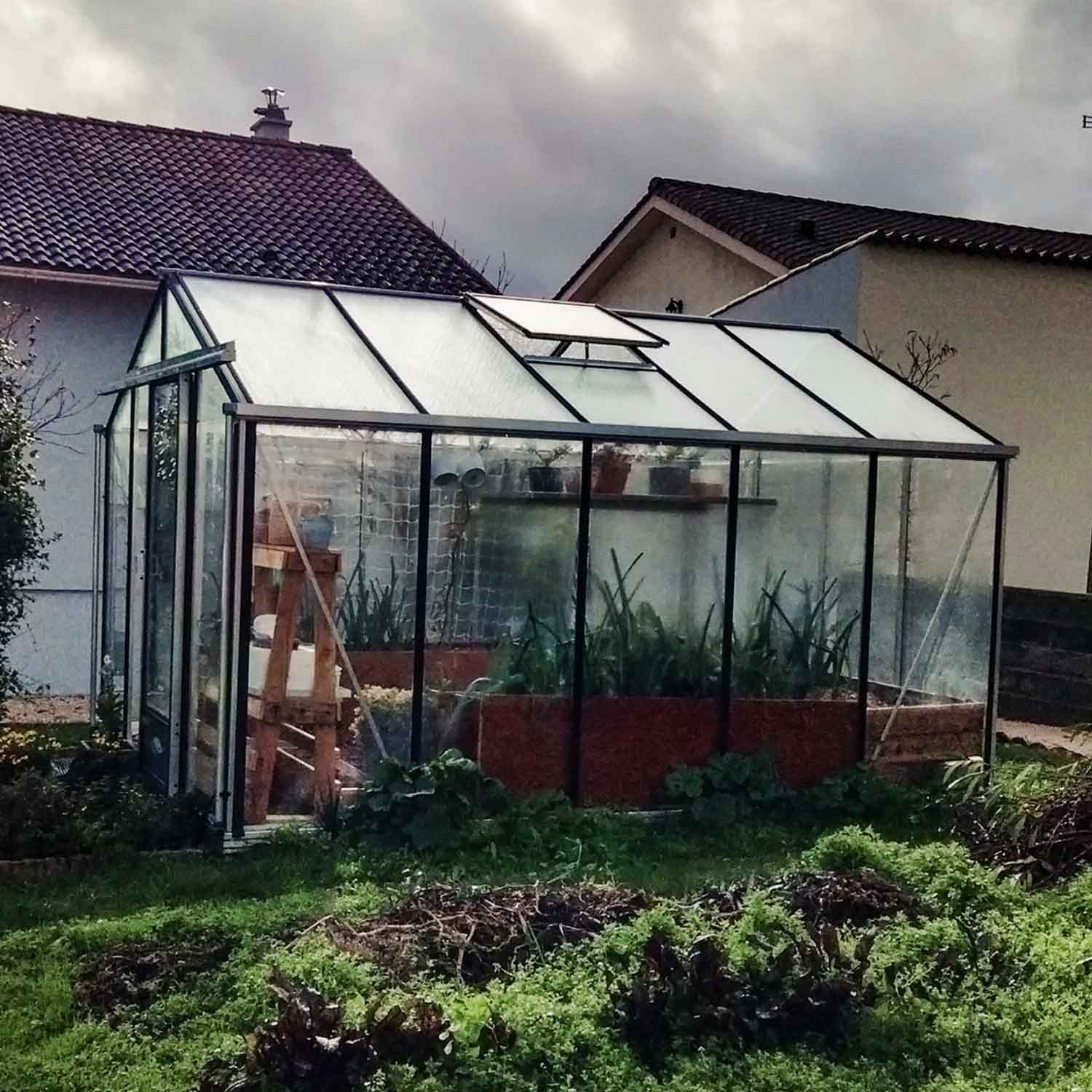 - Der Fundamentrahmen ermöglicht es, den direkten Kontakt der Verglasung mit dem Boden zu vermeiden: weniger Schmutz und leichterer Anbau im Inneren Ihres Gewächshauses.