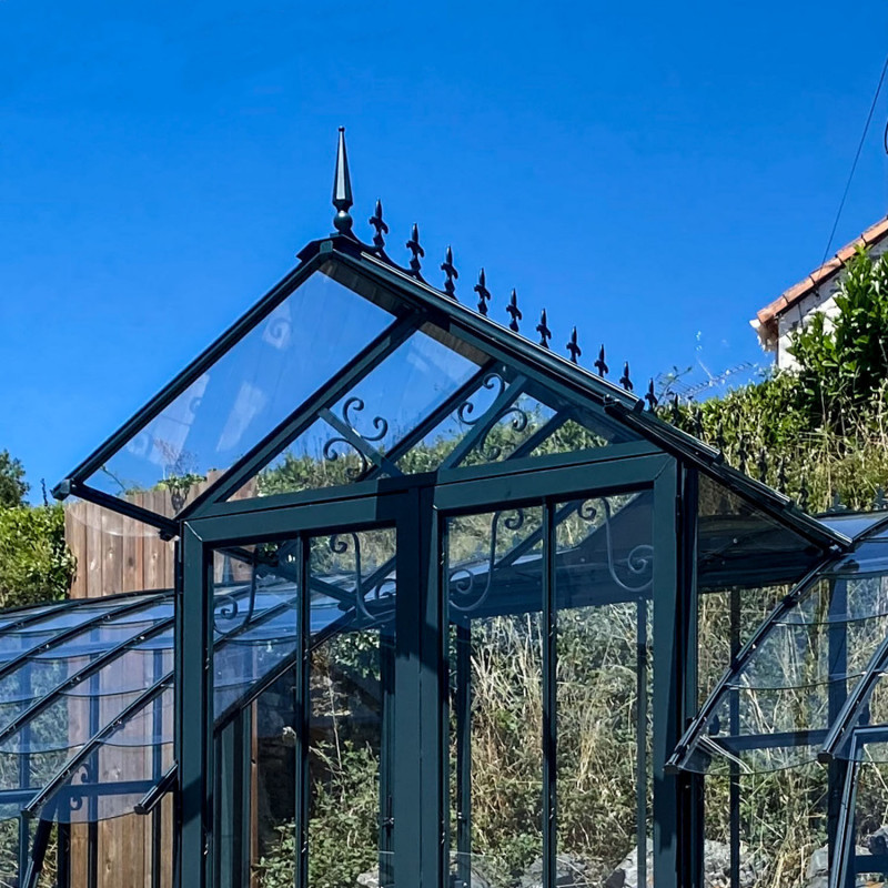 Dachfirstverzierung aus Aluminiumguss, in der gleichen Farbe wie die des Gewächshauses lackiert, für die Gewächshäuser Amboise der Vintage-Kollektion.