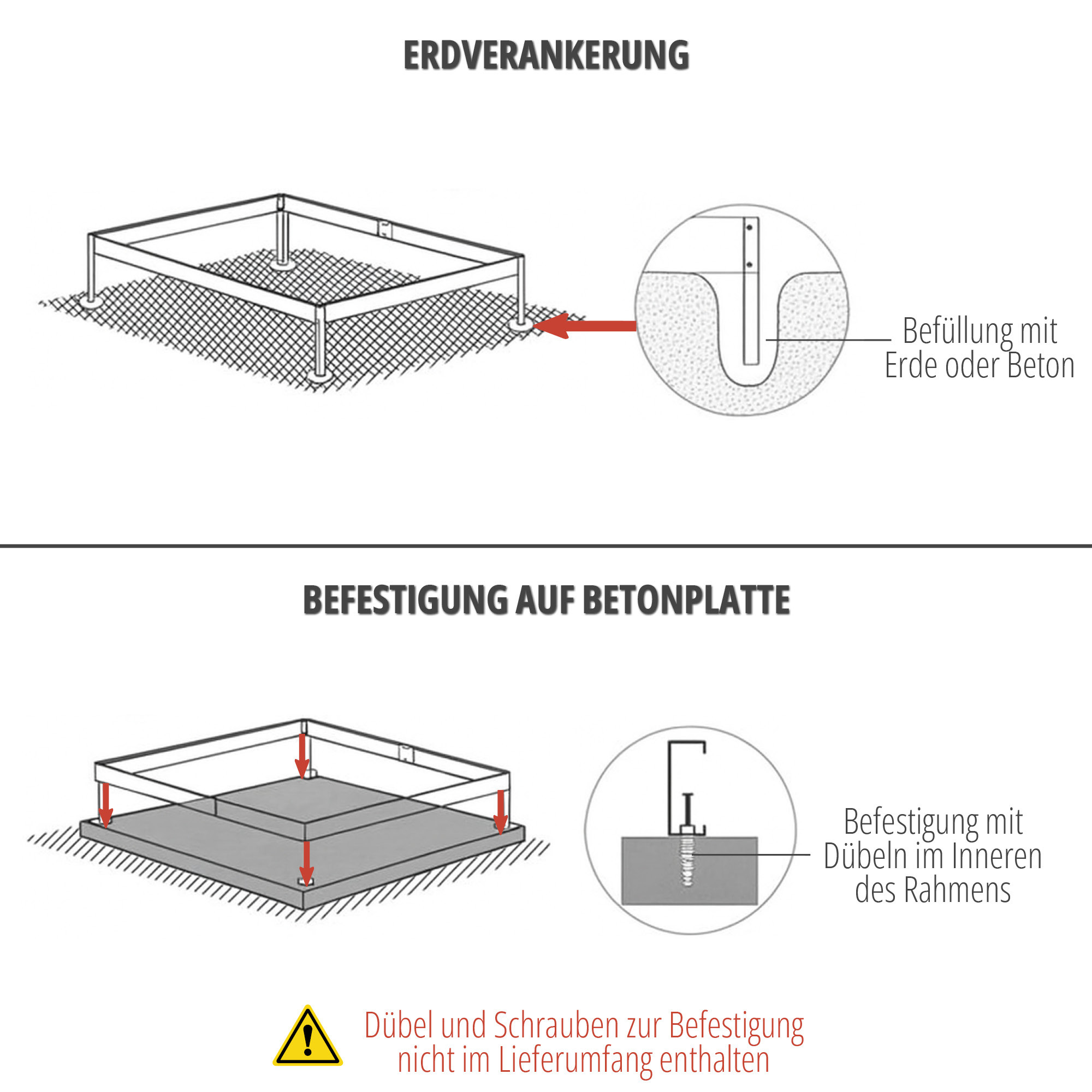 Die Dübelbefestigung erfolgt im Inneren des Fundamentrahmens (Schrauben und Dübel nicht im Lieferumfang enthalten). Es bleibt Ihrer freien Wahl und Entscheidung übelassen, die geigneten Befestigungsmittel entsprechend der von Ihnen gewählten Träger (Holz- oder Betonumrandung, Bausteine, Zementplatten,…) zu verwenden.