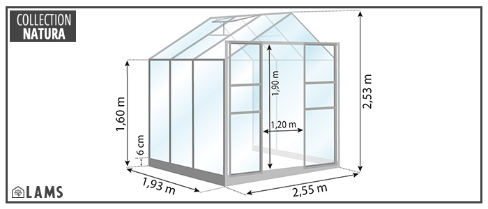 Gewächshaus LAMS Laurus B.2,55 m x L.1,93 m - Firsthöhe 2,53 m - Traufhöhe 1,60 m - Durchsichtiges Sicherheitsglas - Inkl. Fallrohre und Verbindungen - Inkl. Fundamentrahmen