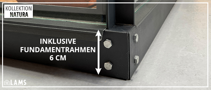 Alle Modelle unserer Natura-Kollektion werden mit einem Fundamentrahmen (in der gleichen Farbe wie das Gewächshaus) geliefert. Der Fundamentrahmen erleichtert die Montage des Gewächshauses und bietet Schutz vor Stößen (Gartenfräse, Rasenmäher...).