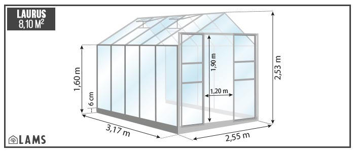 Das Gewächshaus Laurus 8,10 m² besteht aus einer Konstruktion aus Aluminium, einem Dach und Wänden aus 3 mm Sicherheitsglas, einer Schiebetür und einem Dachfenster.