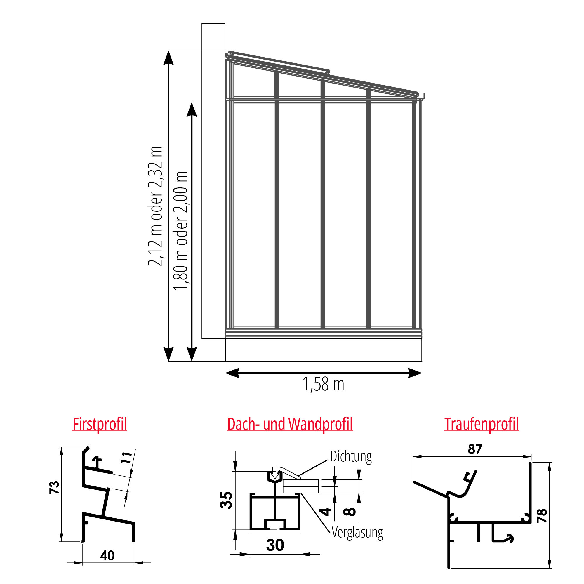 Maße des Anlehngewächshauses LUXIA Retro mit einer Tiefe von 1,58 m