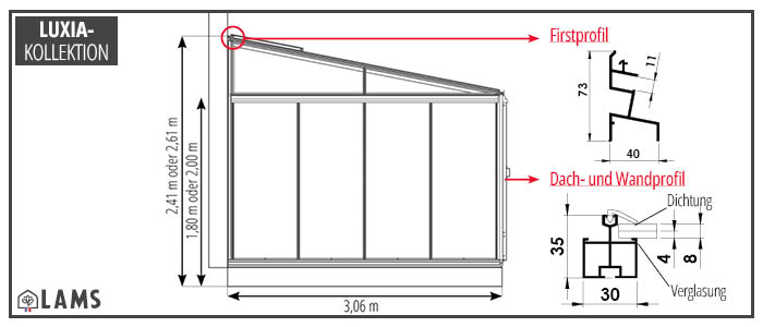 Maße des Anlehngewächshauses LUXIA mit einer Tiefe von 3,06 m