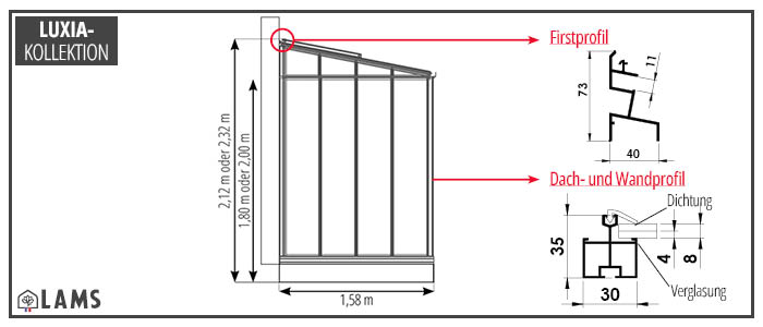 Maße des Anlehngewächshauses LUXIA Retro mit einer Tiefe von 1,58 m