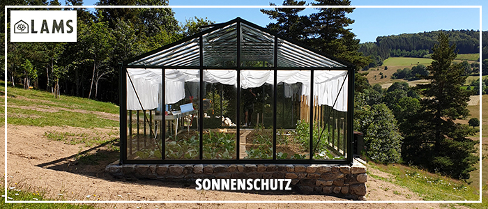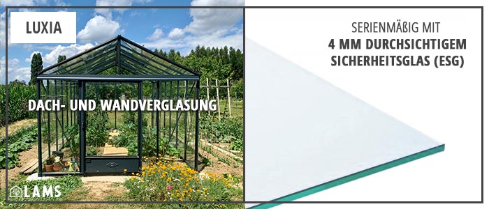 Alle unsere Gewächshäuser sind serienmäßig mit 4 mm durchsichtigem Einscheiben-Sicherheitsglas (ESG) ausgestattet: Sicherheitsglas ist gehärtet und somit, im Gegensatz zu herkömmlichen Blankglas, bei einem Bruch nicht scharfkantig. Neben Stabilität und Langlebigkeit lässt dieses gesicherte Blankglas das meiste Sonnenlicht ins Gewächshaus (80-95%). Sie können einen Schattentuch nutzen um Ihre Pflanzen vor starker Sonnenstrahlung zu schützen.