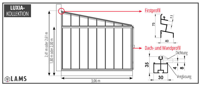 Maße des Anlehngewächshauses LUXIA mit einer Tiefe von 3,06 m