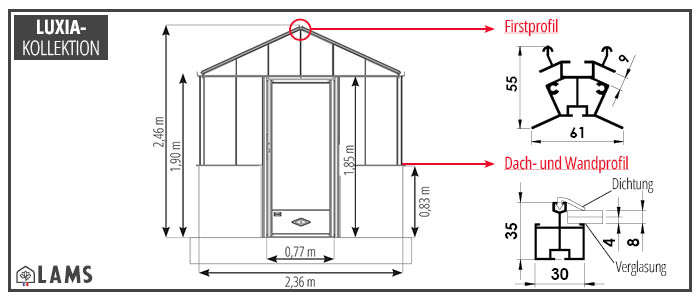 Maße des Gewächshauses Luxia Retro mit einer 2,36 m langen Fassade auf einem Mauersockel