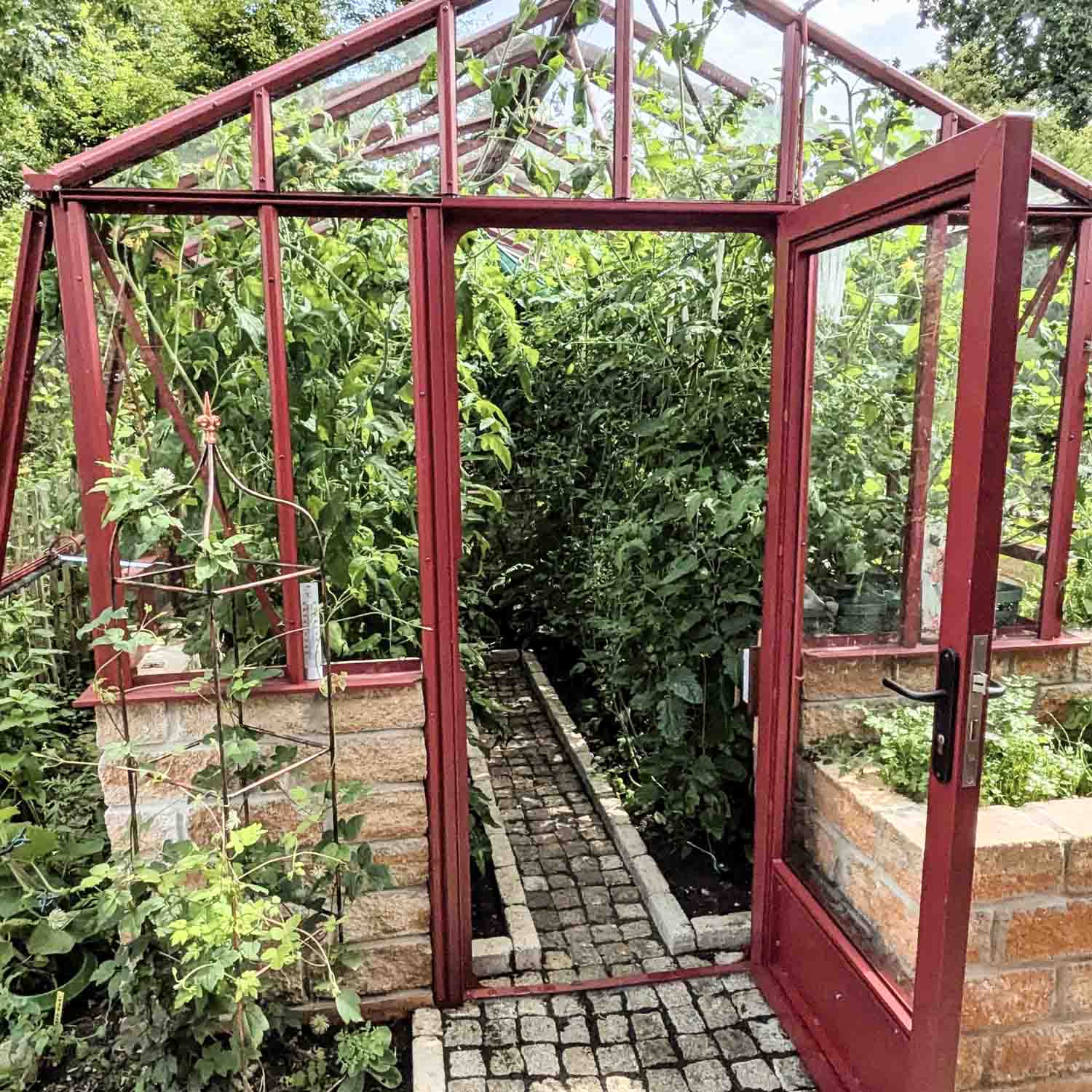 Das Gewächshaus ist mit einer flügeltür (nach außen öffnend) mit komfortablen Abmessungen ausgestattet (Türmaße: B 0,77 x H 1,85 m).