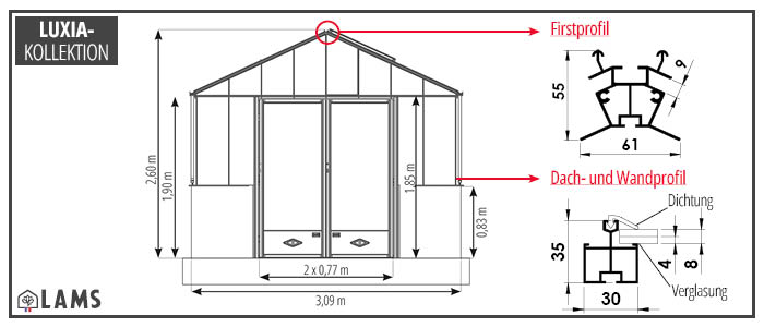 Maße des Gewächshauses Luxia Retro mit einer 3,09 m langen Fassade auf einem Mauersockel
