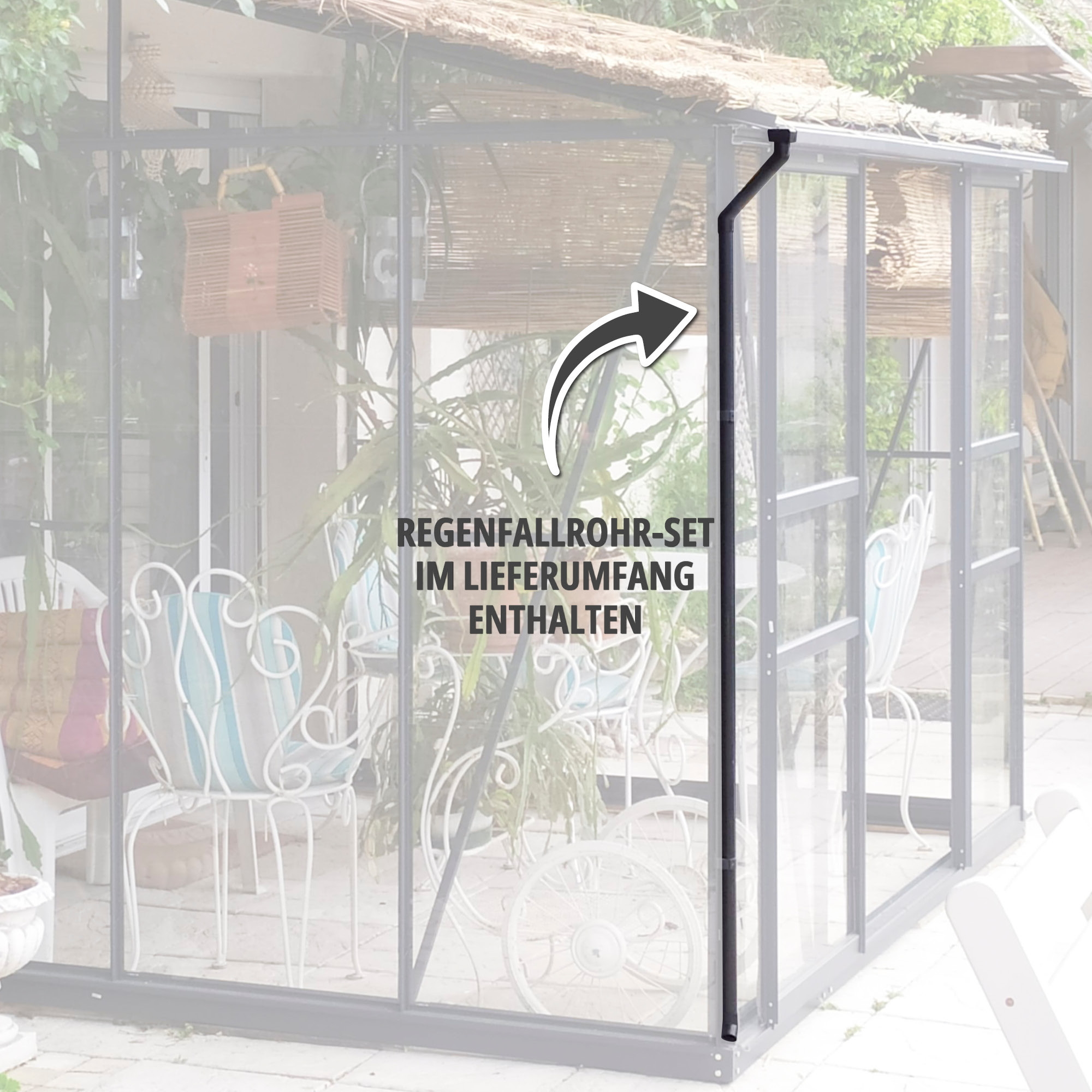 - 1 Fallrohr-Set (eine Verbindung und Fallrohr) ist im Lieferumfang Ihres LAMS-Gewächshauses enthalten. Passen Sie die Höhe des Fallrohrs an Ihre Bedürfnisse an: So können Sie ein Regenwasserbehälter aufstellen.