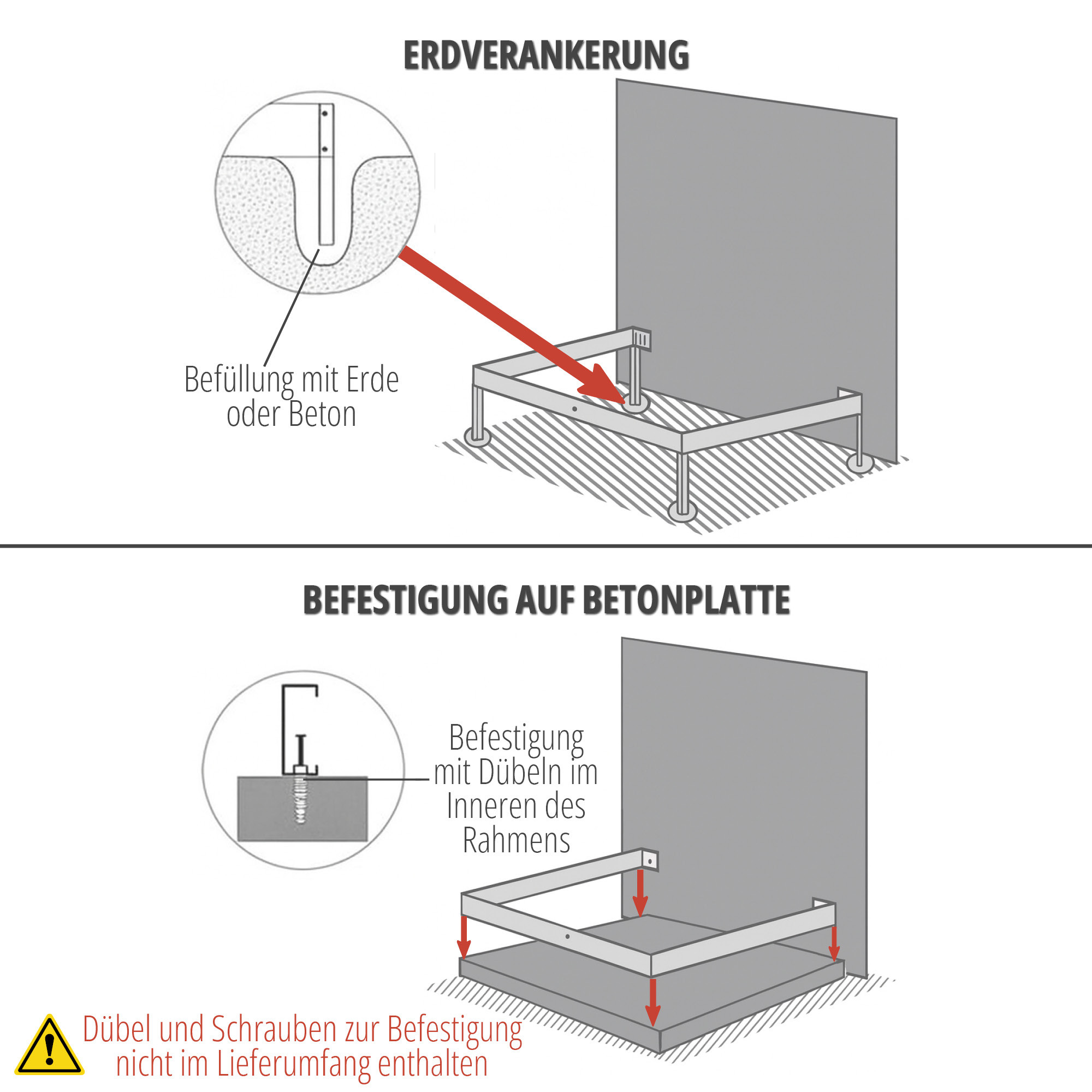 | Befestigung des Gewächshauses am Boden | Punkt-, Streifenfundament oder Betonplatte (Ankerfüße im Lieferumfang enthalten) - Maurerplan wird zur Verfügung gestellt |