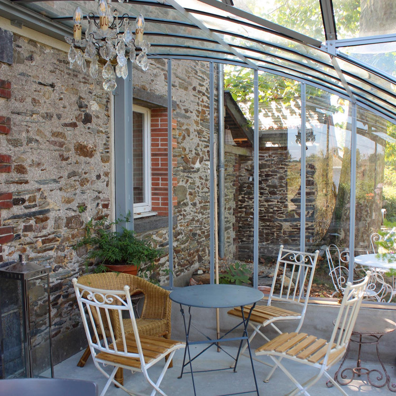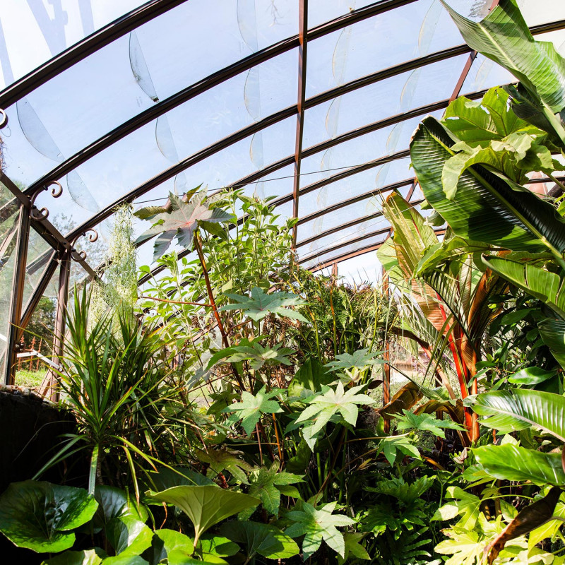 Die 4 mm dicke Verglasung aus Sicherheitsglas wird mit Edelstahlclips befestigt, um eine einfache Montage zu ermöglichen. Das gerundete Dach besteht aus kleinen, ziegelförmigen Glasscheiben, um den Charme der Gewächshäuser von früher zu erhalten.