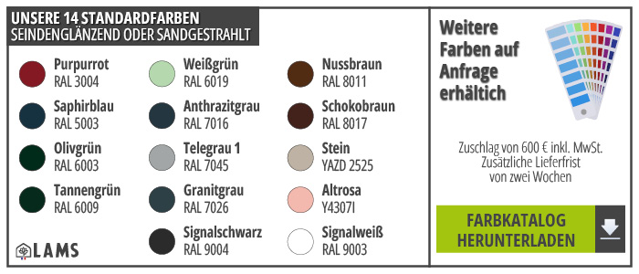 Gegen einen Aufpreis von 600 € (inkl. MwSt.) und einer zusätzlichen Lieferzeit von zwei Wochen können wir die RAL-Farbe Ihrer Wahl herstellen.