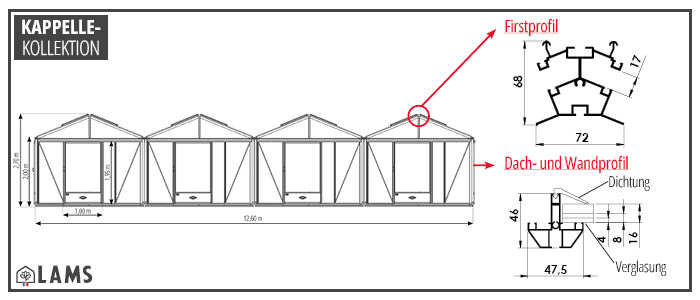 Die Kapellen-Gewächshäuser bestehen aus zusamengefügten B. 3,15 m Supra-Gewächshäuser und haben somit die gleichen Profile.