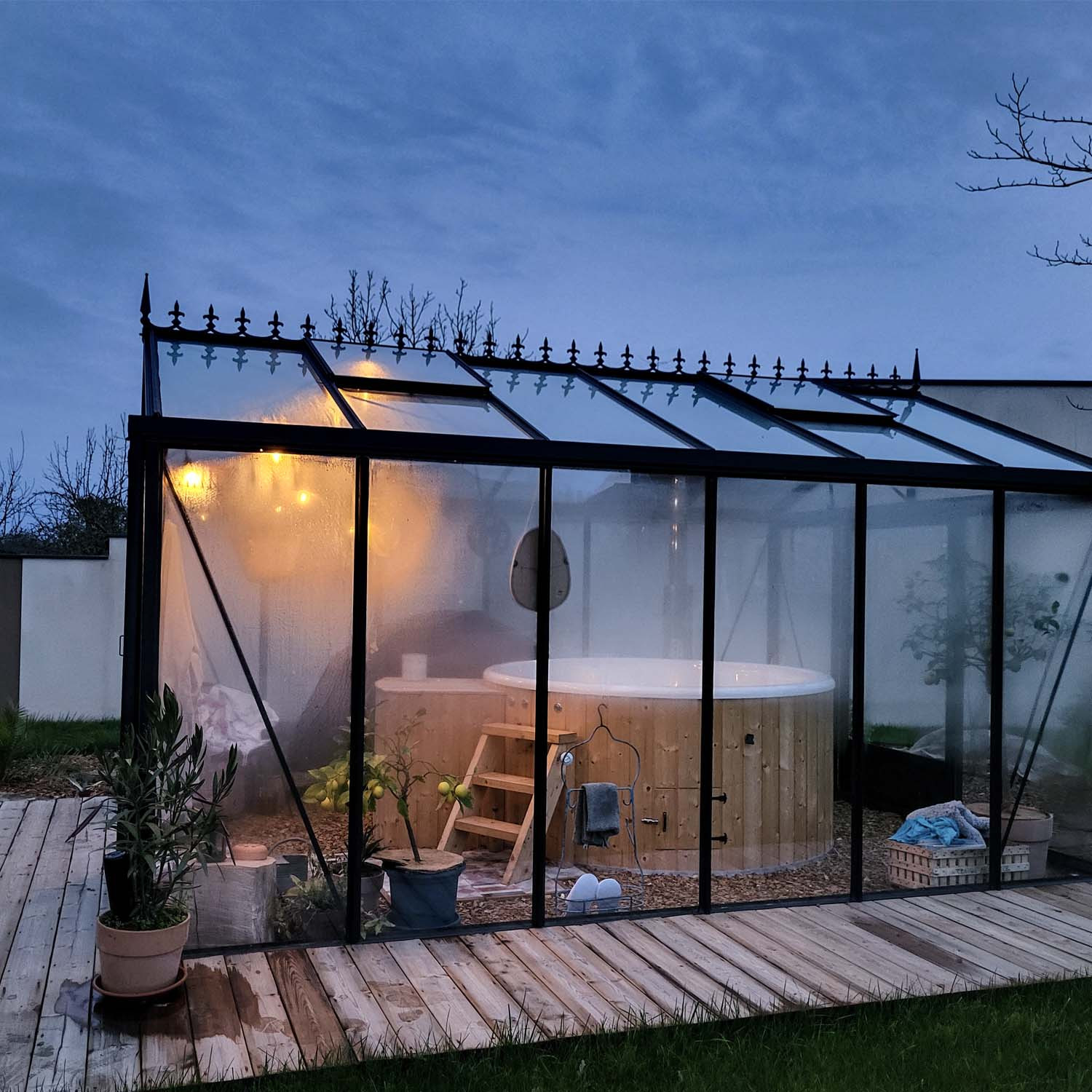 Machen Sie Ihr Gewächshaus zu einem echten Wintergarten mit Gartenmöbeln, indem Sie sich für eine Betonplatte über die gesamte Bodenfläche entscheiden. Genießen Sie den grünen Rahmen Ihres Gartens in einem hellen und gemütlichen Wohnraum.