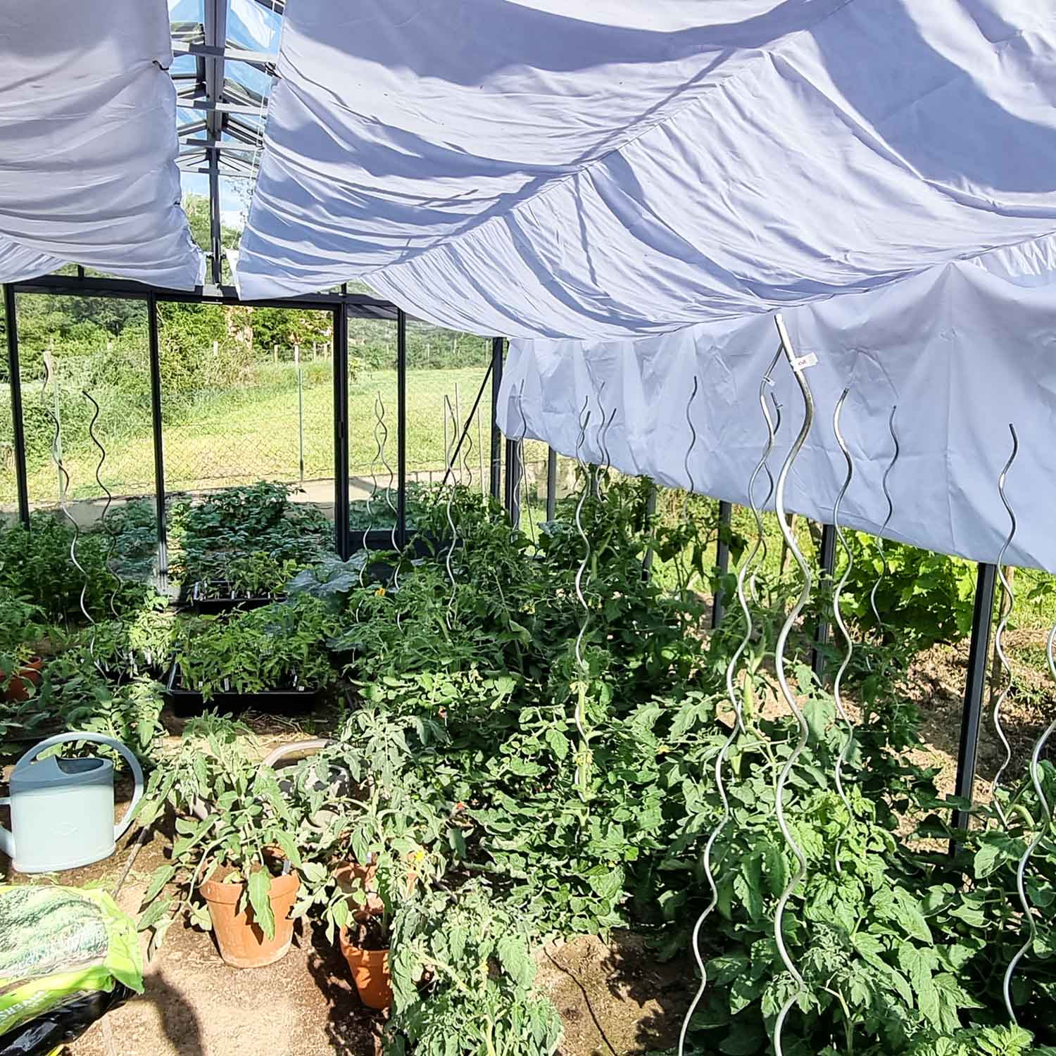Alle unsere Gewächshäuser sind serienmäßig mit 4 mm durchsichtigem Einscheiben-Sicherheitsglas (ESG) ausgestattet: Sicherheitsglas ist gehärtet und somit, im Gegensatz zu herkömmlichem Blankglas, bei einem Bruch nicht scharfkantig. Neben Stabilität und Langlebigkeit lässt dieses gesicherte Blankglas das meiste Sonnenlicht ins Gewächshaus (80-95%). Sie können einen Schattentuch nutzen um Ihre Pflanzen vor starker Sonnenstrahlung zu schützen.