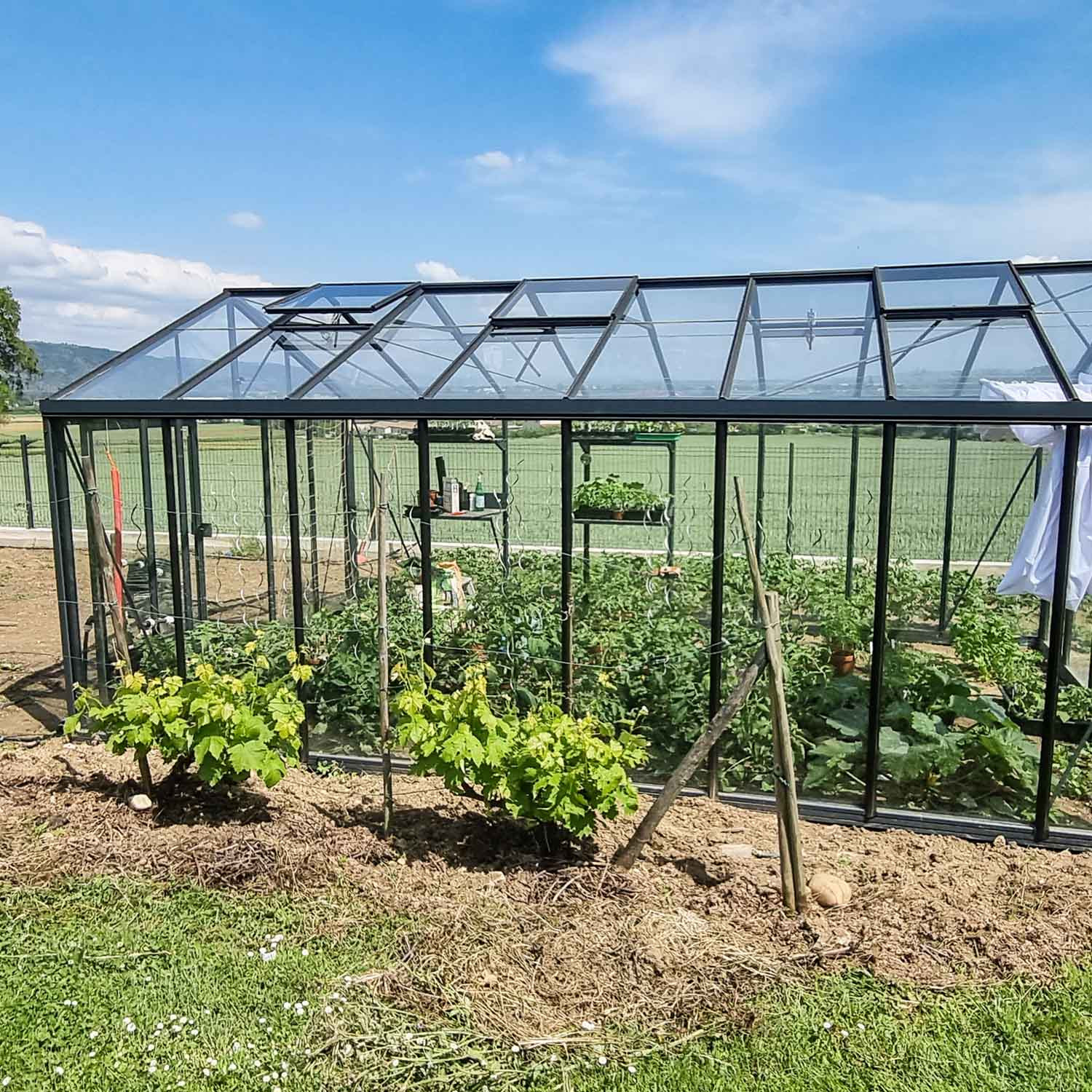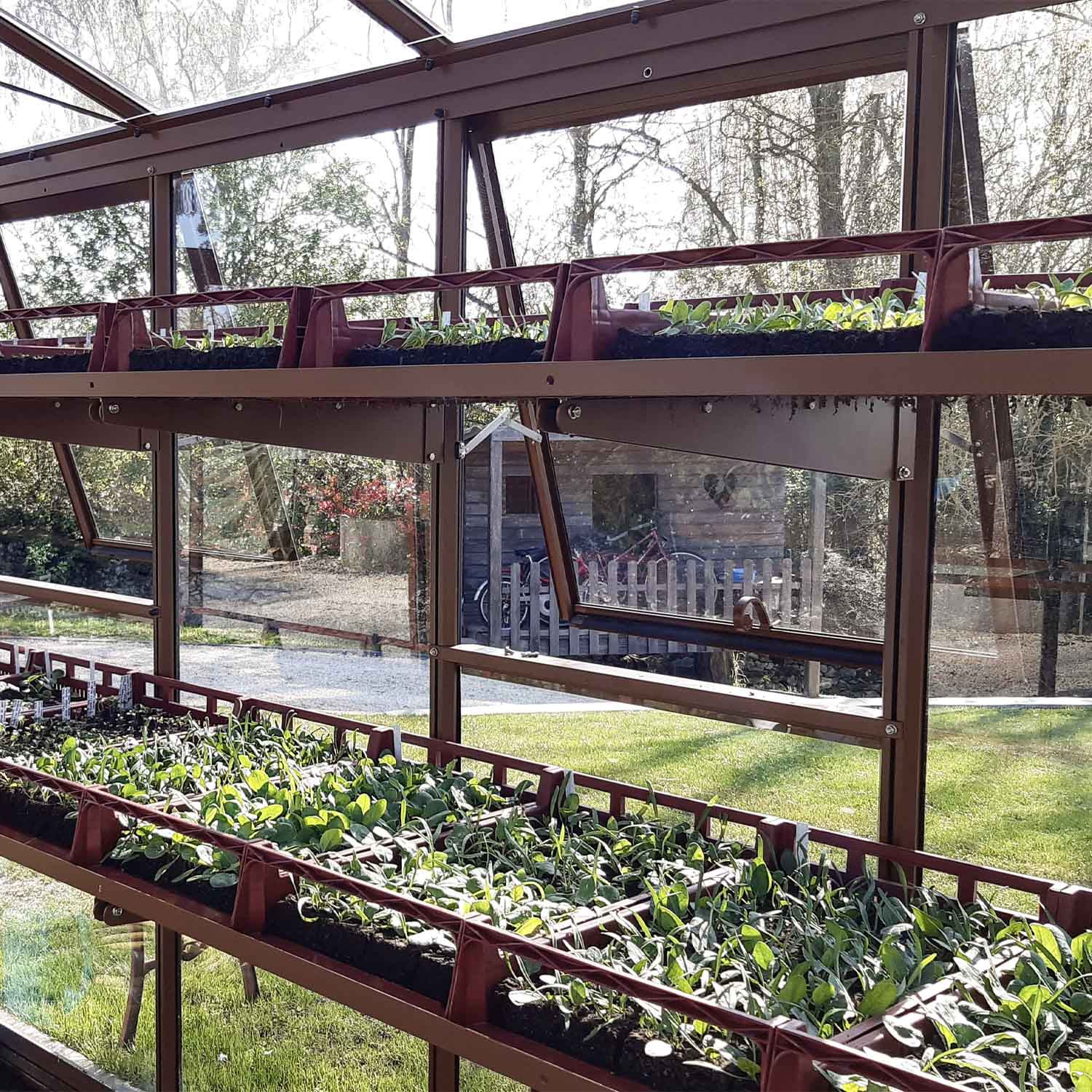 - Der Fundamentrahmen ermöglicht es, den direkten Kontakt der Verglasung mit dem Boden zu vermeiden: weniger Schmutz und leichterer Anbau im Inneren Ihres Gewächshauses.