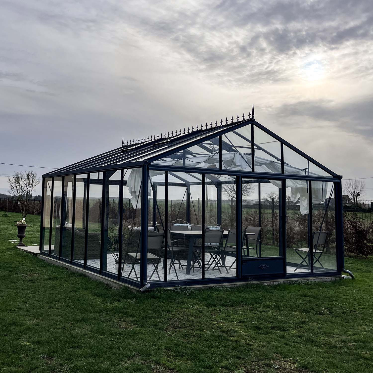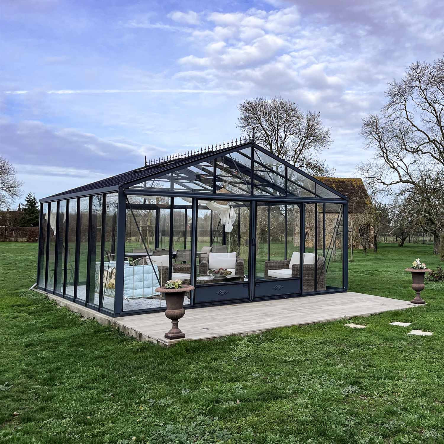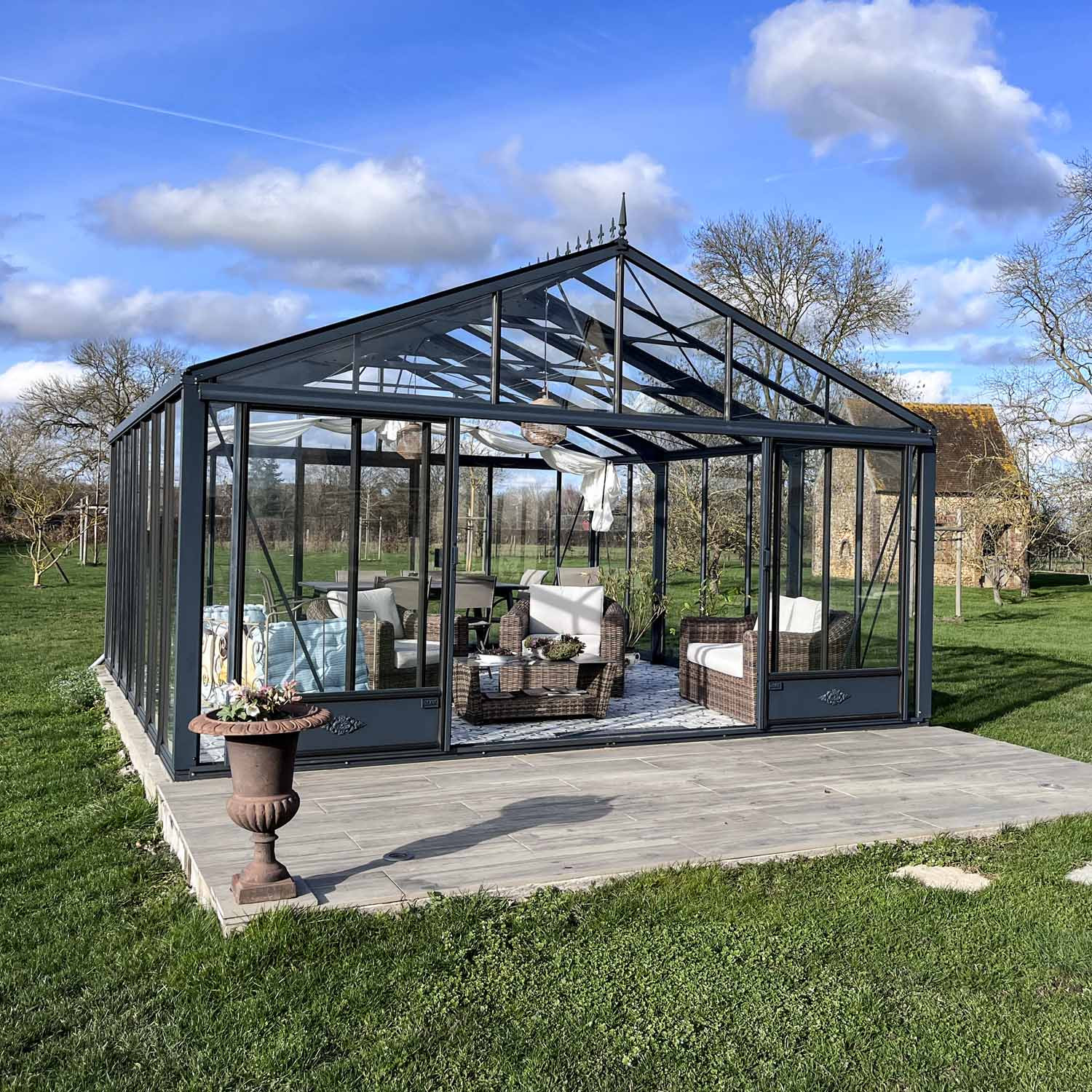 Machen Sie Ihr Gewächshaus zu einem echten Wintergarten mit Gartenmöbeln, indem Sie sich für eine Betonplatte über die gesamte Bodenfläche entscheiden. Genießen Sie den grünen Rahmen Ihres Gartens in einem hellen und gemütlichen Wohnraum.
