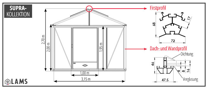 MAßE DES GARTENGEWÄCHSHAUSES SUPRA MIT EINER 3,15 M LANGEN FASSADE